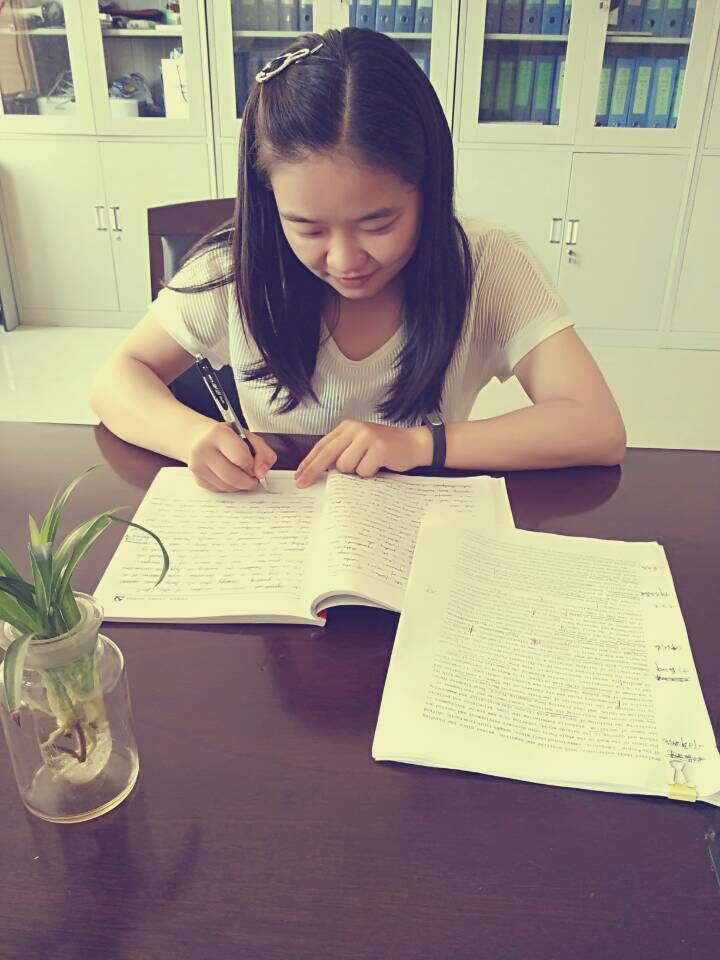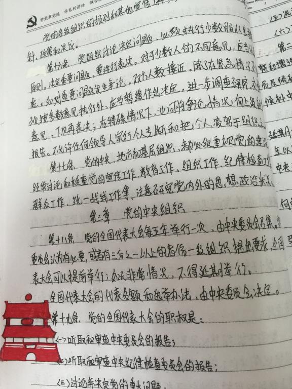 其中,特别值得一提的是教职工第三支部的关菡同志,她是我校一名青年职工党员,在刚刚拿到党章手抄本时,就很高兴的告诉大家,决定要手抄英文版党章。她说:“我不喜欢作秀,也不喜欢走形式,不想把手抄党章当作一项任务去完成,手抄英文版党章不仅可以让我学习到党章党规知识,还能学习英语,我想把手抄党章这样有意义的事做得既有意思又有效果,诚心正意、拒绝作秀。”看着她的党章手抄本,一行行干净整齐秀气的英文字迹,一条条用红笔标注的单词注解,看到的不仅仅是她的认真,看到的更是青年党员对党的热爱和从他们身上体现出来的深学、笃用、实干、创新,以求知行合一的精神。