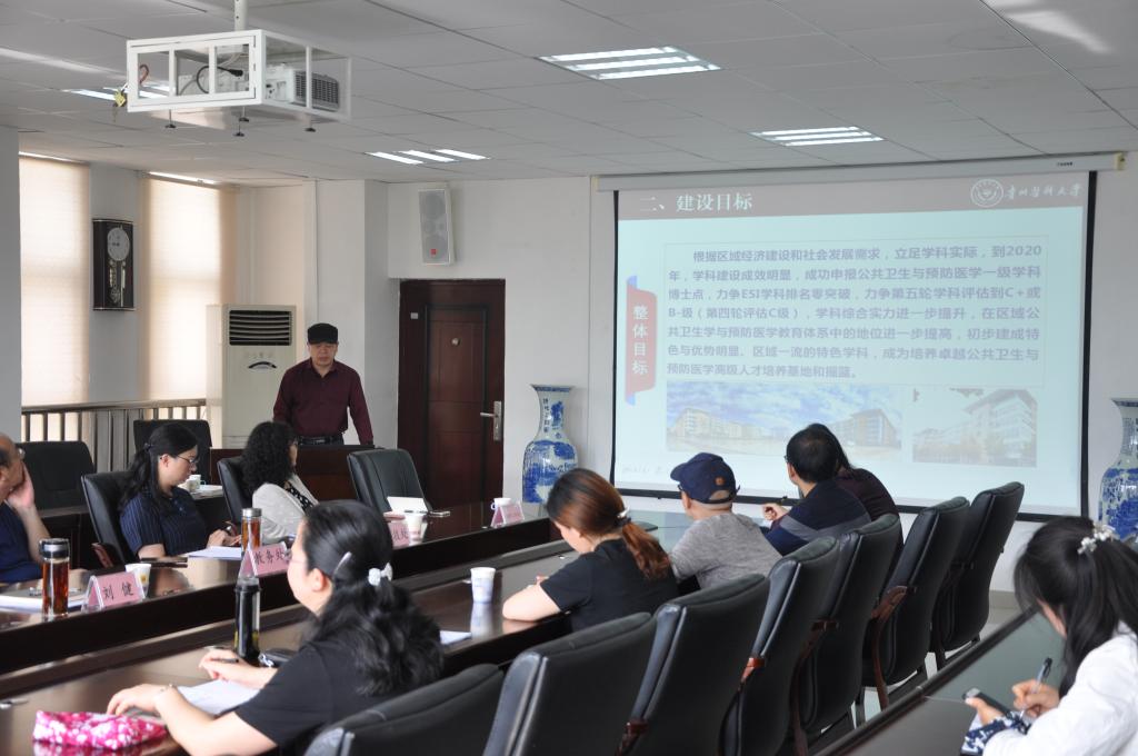 会上,公共卫生学院院长洪峰汇报了学院的基本情况、公共卫生与预防医学一流学科建设目标及建设进展情况,包括师资队伍建设、科学研究、人才培养、平台建设、社会服务、文化传承、交流与合作、建设经费使用情况以及建设过程中存在的主要问题与困难等。