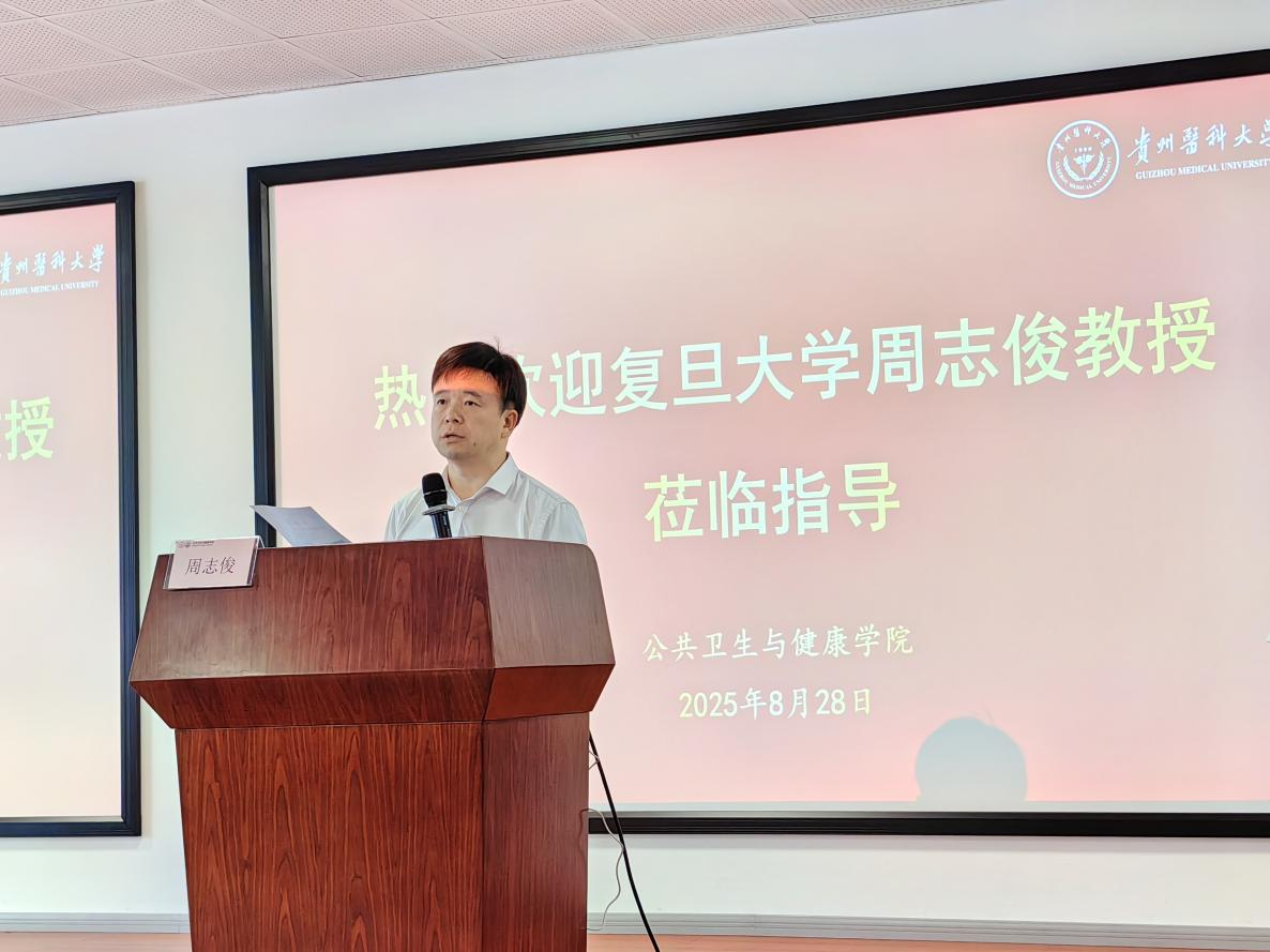 2025年8月28日上午,复旦大学公共卫生学院周志俊教授莅临我校公共卫生与健康学院,为我院师生作题为《基于某农村地区的小型出生队列工作介绍》的学术讲座。贵州医科大学副校长洪峰教授、公共卫生与健康学院副院长(主持工作)李军教授、学院党委副书记何江、副院长张清海教授出席,讲座由洪峰教授主持,公共卫生与健康学院200余名师生参加。