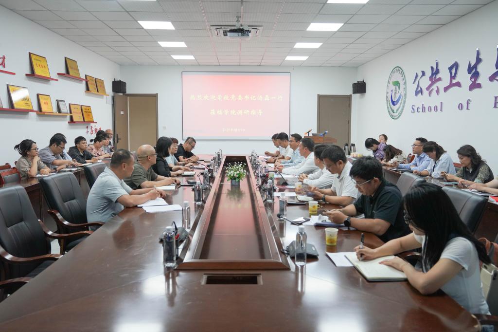 会上,汤磊对公共卫生与健康学院近年来建设发展取得的成绩给予肯定,向大家对高水平医科大学建设所作的努力和贡献表示感谢。他指出,今天调研座谈的目的很明确,就是来了解情况,听听大家的想法,一起聚焦问题、共话发展。公共卫生与健康学院是学校的老牌院系,也是标杆学院,有着良好的文化精神传承和敬业务实作风,各项工作都走在前列,也形成了可供借鉴参考的宝贵经验。当前,国家正大力推进高水平公共卫生学院建设,全国第六轮学科评估也日益临近,这对我们大家而言,既是时代机遇,也是现实挑战。