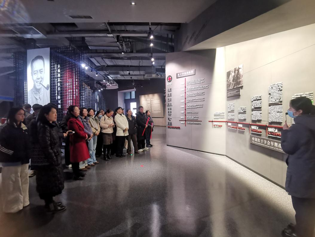 在讲解员的引导下,同志们沿着历史的轨迹,通过珍贵的历史照片、实物展品与详实文献,重温了中国红十字会救护总队在抗战烽火中毅然扎根贵阳图云关,以“医者仁心、救死扶伤”为信念,全力支援前线、服务伤员的感人历程,深切感受了那段艰苦卓绝却充满人道光辉的峥嵘岁月。从战地救护的紧急筹建与物资艰难筹措,到医护人员在炮火中无畏前行、舍生忘死的奉献壮举;从简陋条件下坚持医学培训与技术革新,到跨越国界、携手国际友人的医疗合作,每一件实物、每一段记述都让党员们肃然起敬,深刻体会到前辈们矢志不渝的爱国情怀、大爱无疆的人道主义精神,以及在战地救护、公共卫生救援与国际医疗援助中所作出的不可磨灭的贡献。