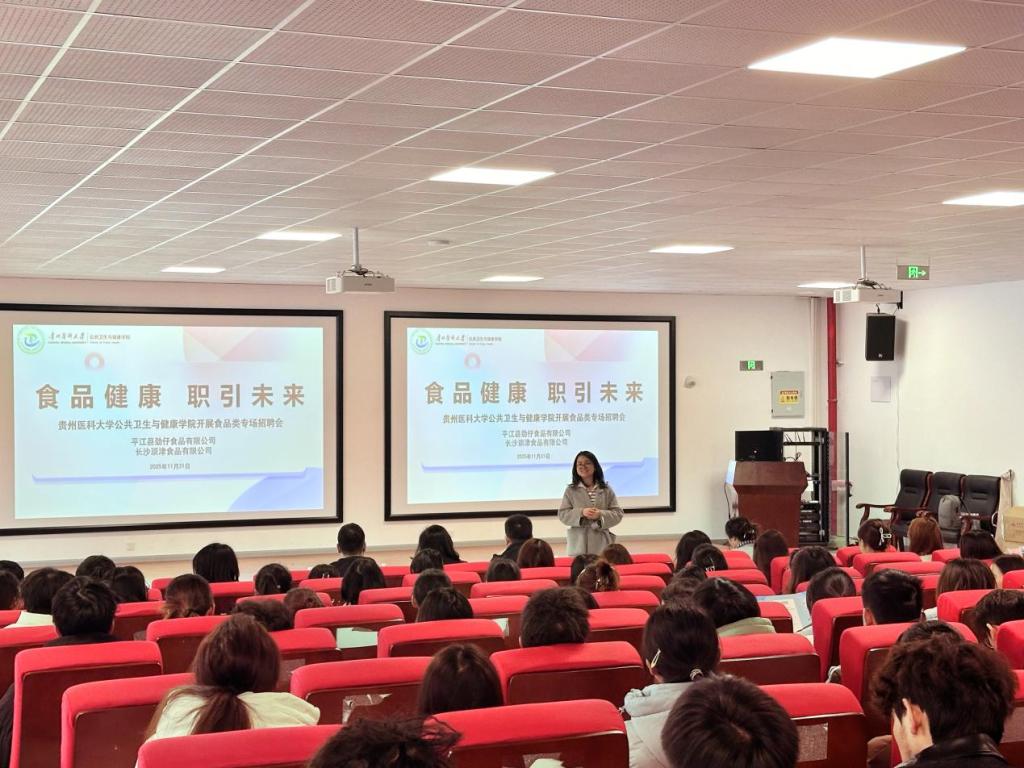 11月21日,公共卫生与健康学院在云漫湖校博雅楼C3-3-16报告厅举行“食品健康 职引未来”-食品类专业专场招聘会。湖南省平江县劲仔食品有限公司人力资源总经理黄采花一行、长沙顶津食品有限公司校企专员王建,公共卫生与健康学院副院长张清海、学生科副科长原琦、毕业班辅导员李德健以及各年级食品专业学生参加。活动由食品科学学系主任周艳主持。