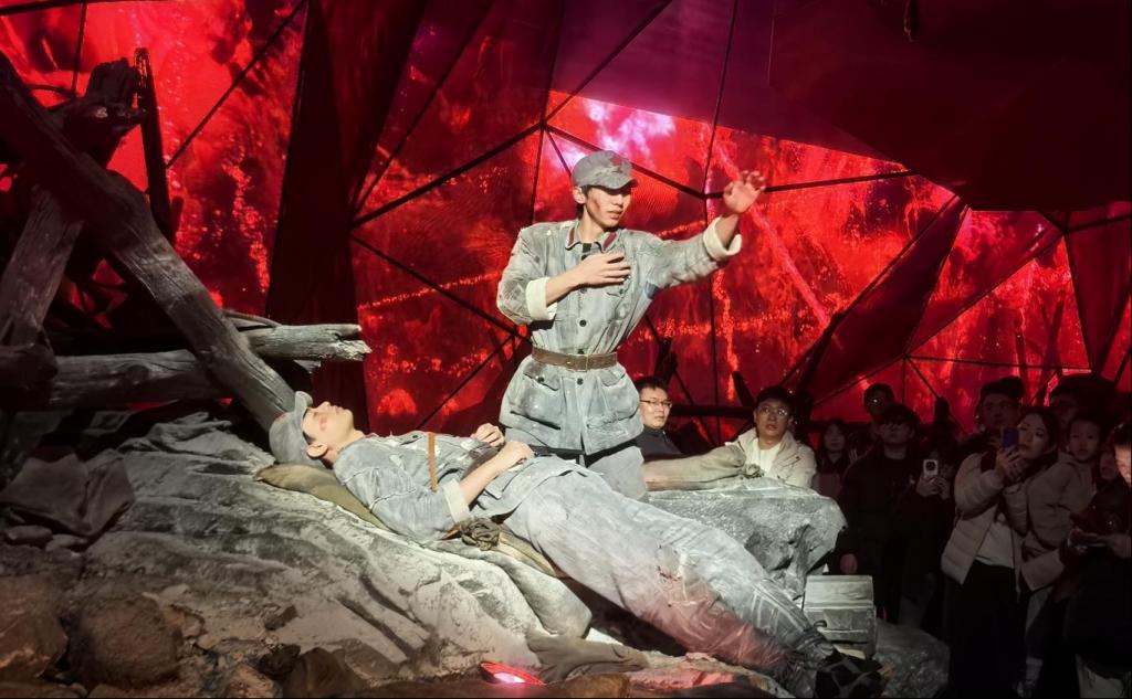 “血火洗礼”篇章中,双曲幕与震动特效交织重现湘江战役的悲壮场景,硝烟气息与枪炮声响营造出沉浸式战场体验,当看到红军战士浴血奋战的画面时,现场学子无不屏息动容。“伟大转折” 展区通过机械结构巧妙切换场景,遵义会议的历史细节清晰呈现,让学子们直观理解 “生死攸关的转折点” 背后的信仰力量。在“砥砺征途”环节,模拟低温环境与实景布置还原了雪山草地的艰险,刺骨寒意中,大家更深刻体会到红军“风雨侵衣骨更硬”的坚韧品格。从“四渡赤水”的军事奇迹到“巧渡金沙江”的机智果敢,六个篇章的沉浸式展演让长征史诗在科技赋能下焕发新生。