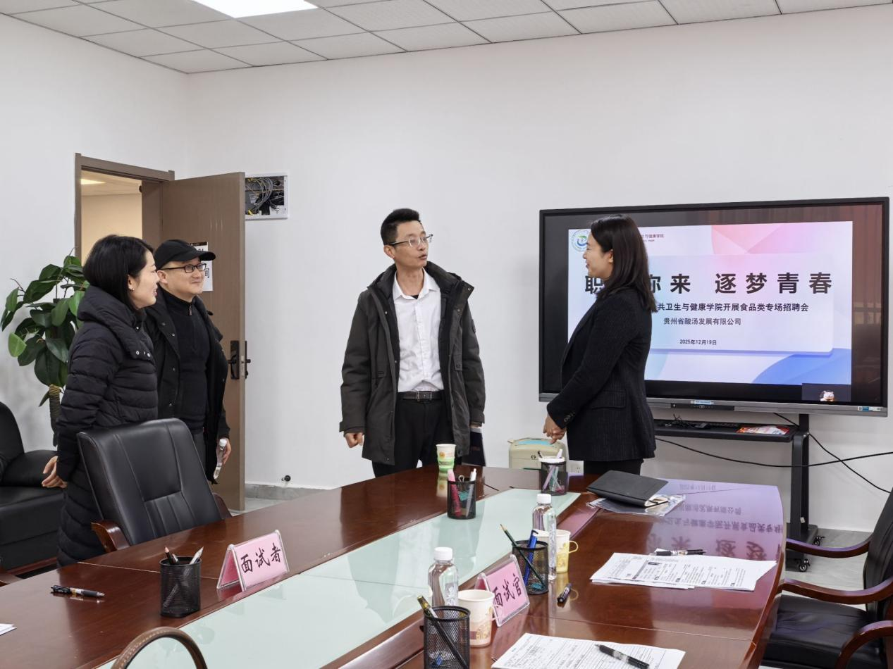 2025年12月19日,公共卫生与健康学院在云漫湖校区公卫组团博远楼C3-2-24成功举办“职等你来 逐梦青春”食品类专场招聘会,旨在精准搭建毕业生与用人单位双向选择平台,助力学子高质量就业。本次活动邀请到贵州省酸汤发展有限公司分管人事、财务的副总经理李芳带队到现场招聘。